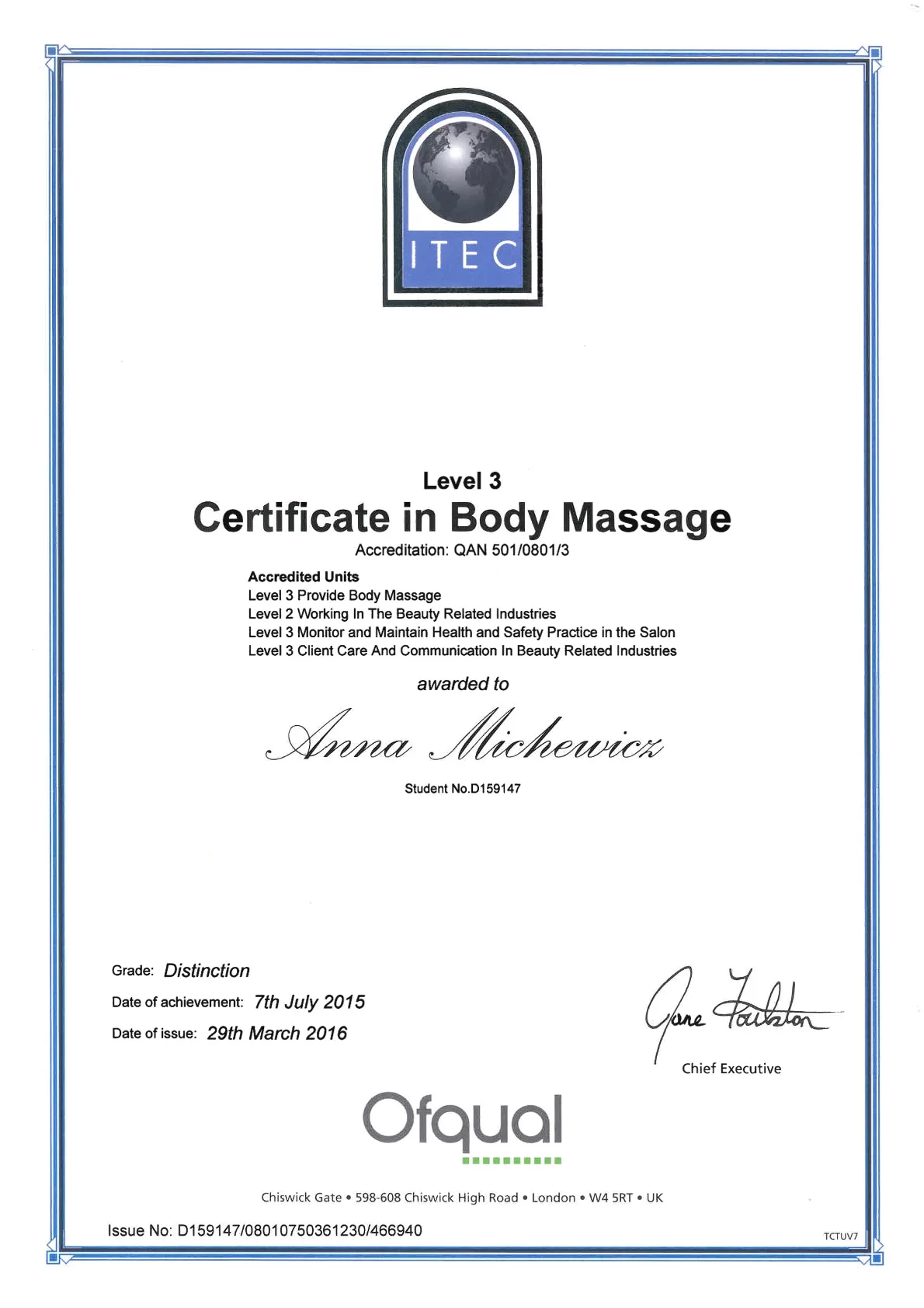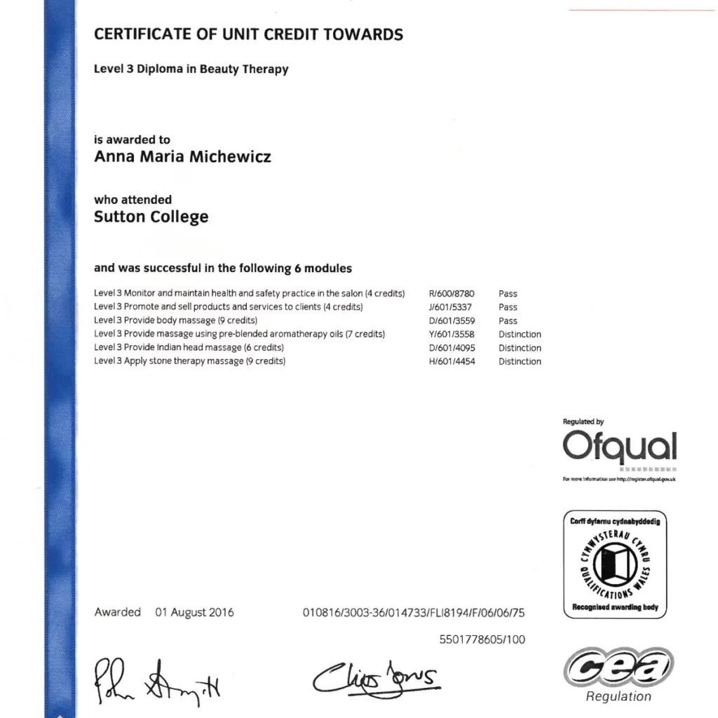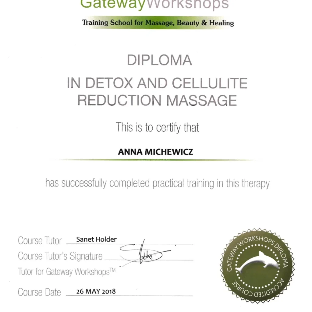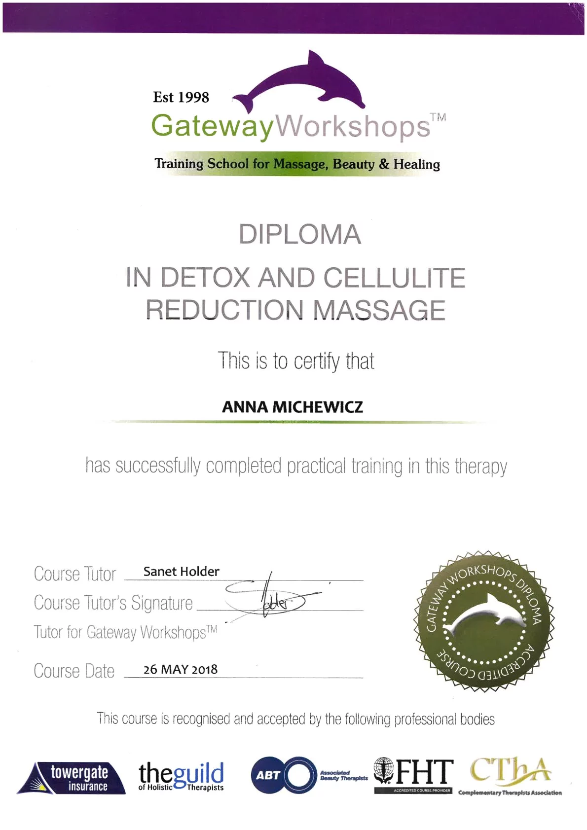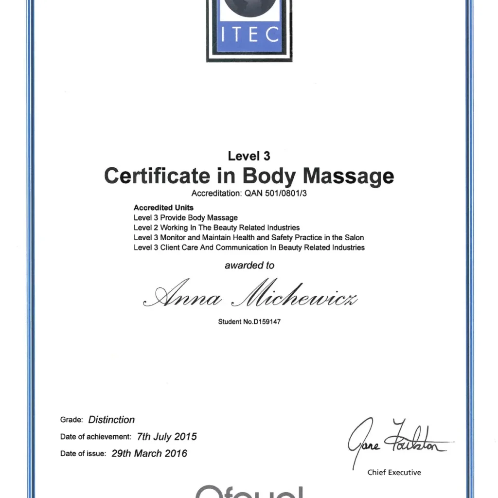 W 2014 r. rozpoczynałam naukę w college’u na kierunku Beauty Specialist, gdy zostałam poproszona by być modelką podczas próbnego egzaminu z masażu ciała. I tak to się wszystko zaczęło. Błogi stan relaksu i odprężenia w jaki zostało wprowadzone moje ciało i umysł, spowodowały, że postanowiłam zgłębić tajniki sztuki masażu i jeszcze w tym samym roku, oprócz wspomnianego wyżej kierunku, rozpoczęłam naukę na kierunku Masaż ciała. Oba tytuły Diploma for Beauty Specialists i Certificate in Body Massage uzyskałam w ciągu 1-go roku szkolnego. Od tamtego czasu nieustannie poszerzam swoją wiedzę i zdobywam nowe umiejętności.