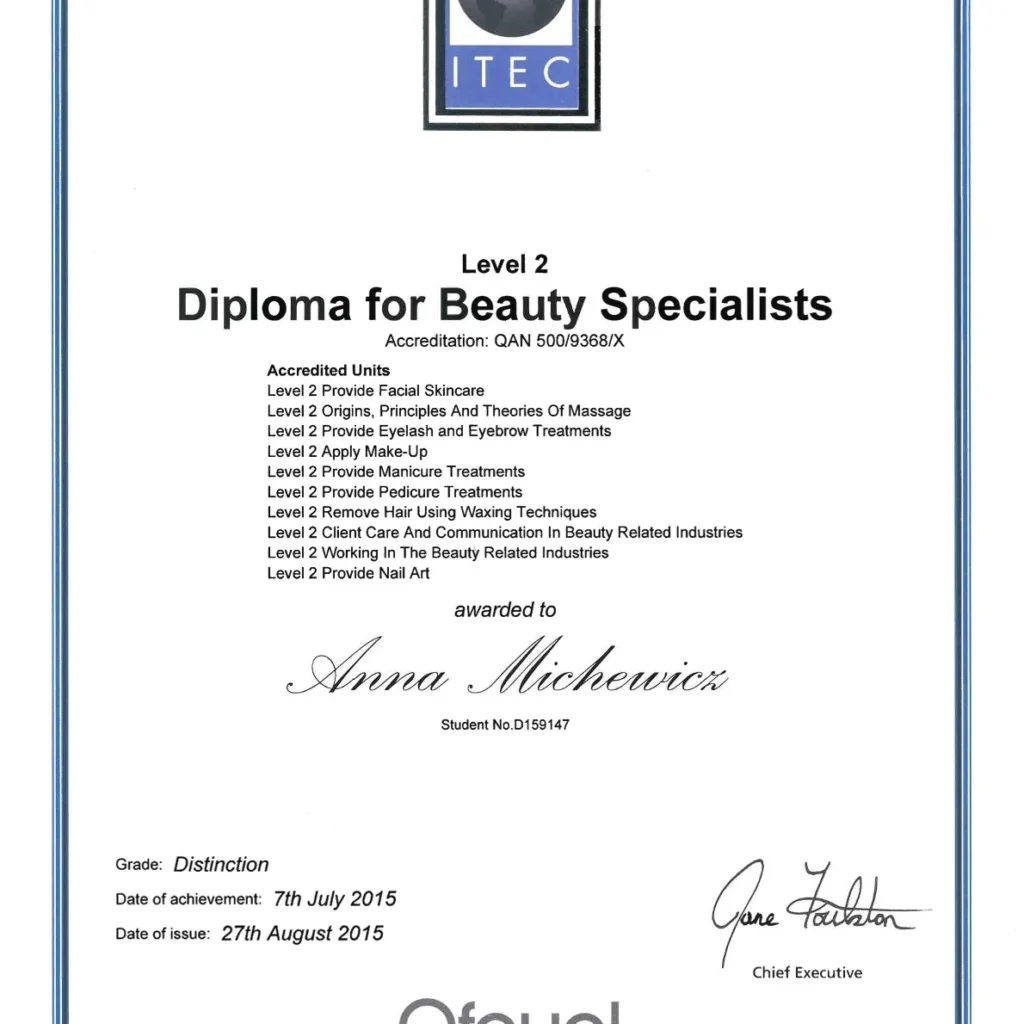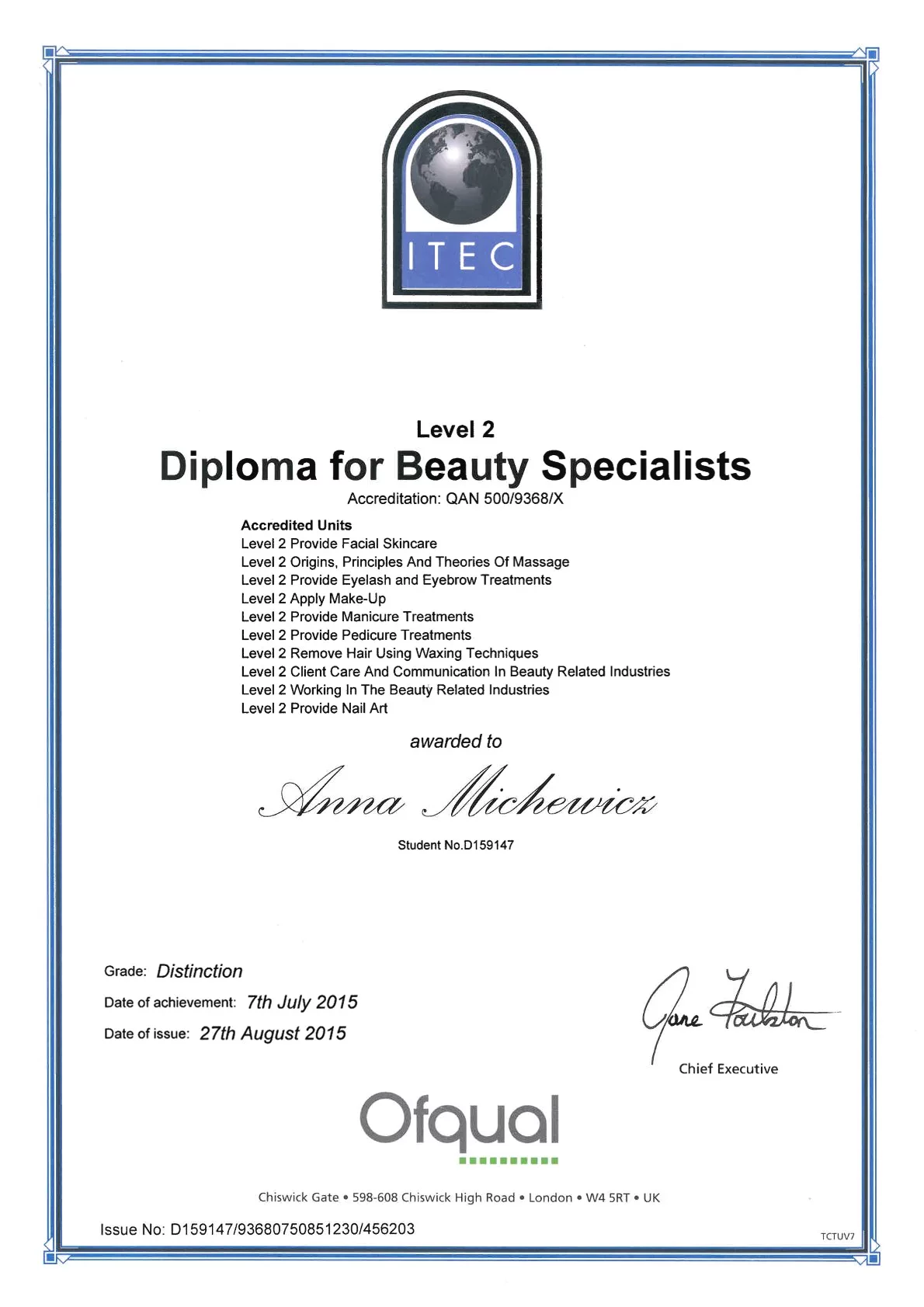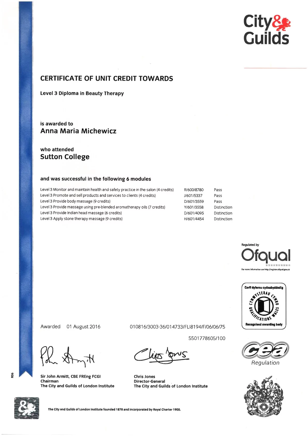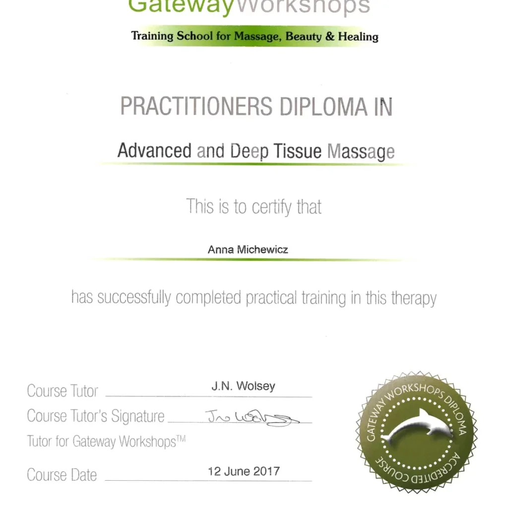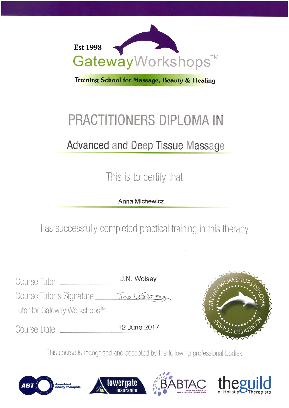 W 2014 r. rozpoczynałam naukę w college’u na kierunku Beauty Specialist, gdy zostałam poproszona by być modelką podczas próbnego egzaminu z masażu ciała. I tak to się wszystko zaczęło. Błogi stan relaksu i odprężenia w jaki zostało wprowadzone moje ciało i umysł, spowodowały, że postanowiłam zgłębić tajniki sztuki masażu i jeszcze w tym samym roku, oprócz wspomnianego wyżej kierunku, rozpoczęłam naukę na kierunku Masaż ciała. Oba tytuły Diploma for Beauty Specialists i Certificate in Body Massage uzyskałam w ciągu 1-go roku szkolnego. Od tamtego czasu nieustannie poszerzam swoją wiedzę i zdobywam nowe umiejętności.