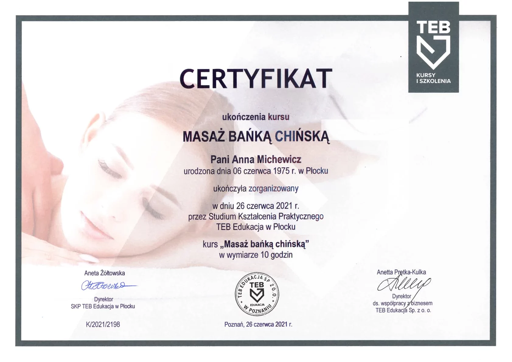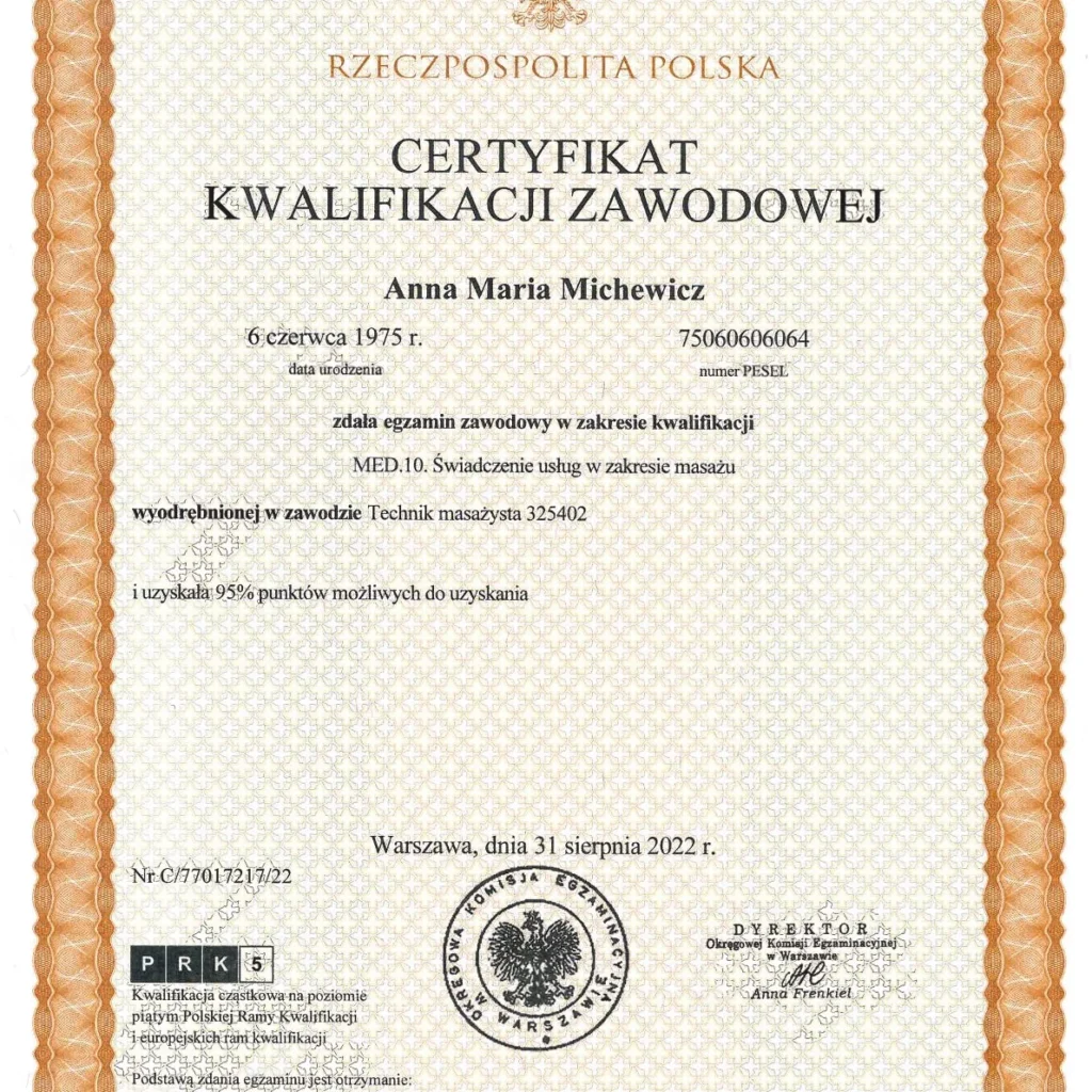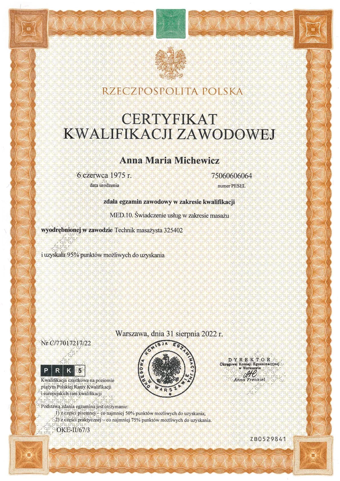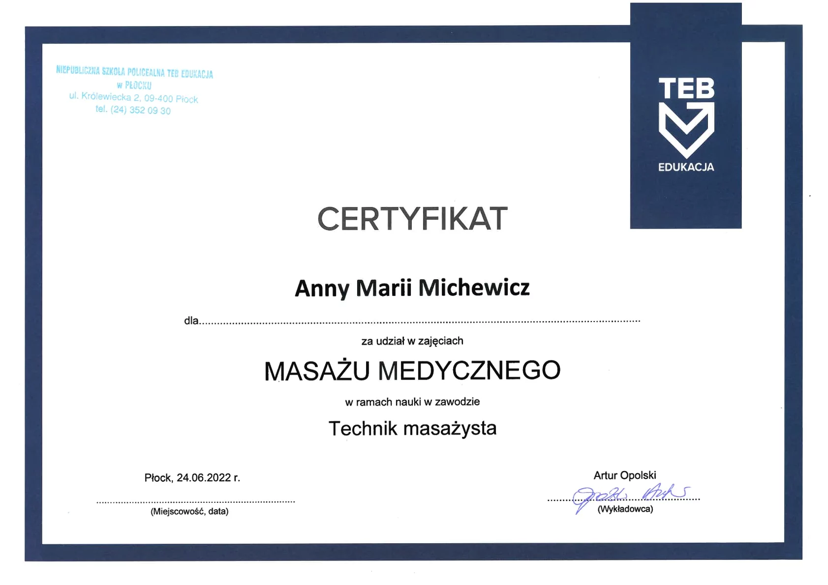 W lipcu 2018 r. wróciłam z moją rodziną do Polski. Z biegiem lat moją uwagę i zainteresowanie przyciągnęły głębsze aspekty masażu, czyli jego wpływ nie tylko na sferę emocjonalną i duchową, ale również fizyczną organizmu ludzkiego. Chęć poznania zasad funkcjonowania organizmu ludzkiego jako całości, jego anatomii i fizjologii oraz źródeł bóli i napięć mięśniowych innych niż te spowodowane stresem i trybem życia, spowodowały, że we wrześniu 2020 r. podjęłam naukę na 2-letnim kierunku technika masażysty z elementami fizjoterapii. Szkołę ukończyłam z wynikiem bardzo dobrym w czerwcu 2022 r.