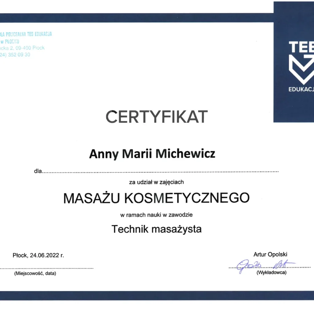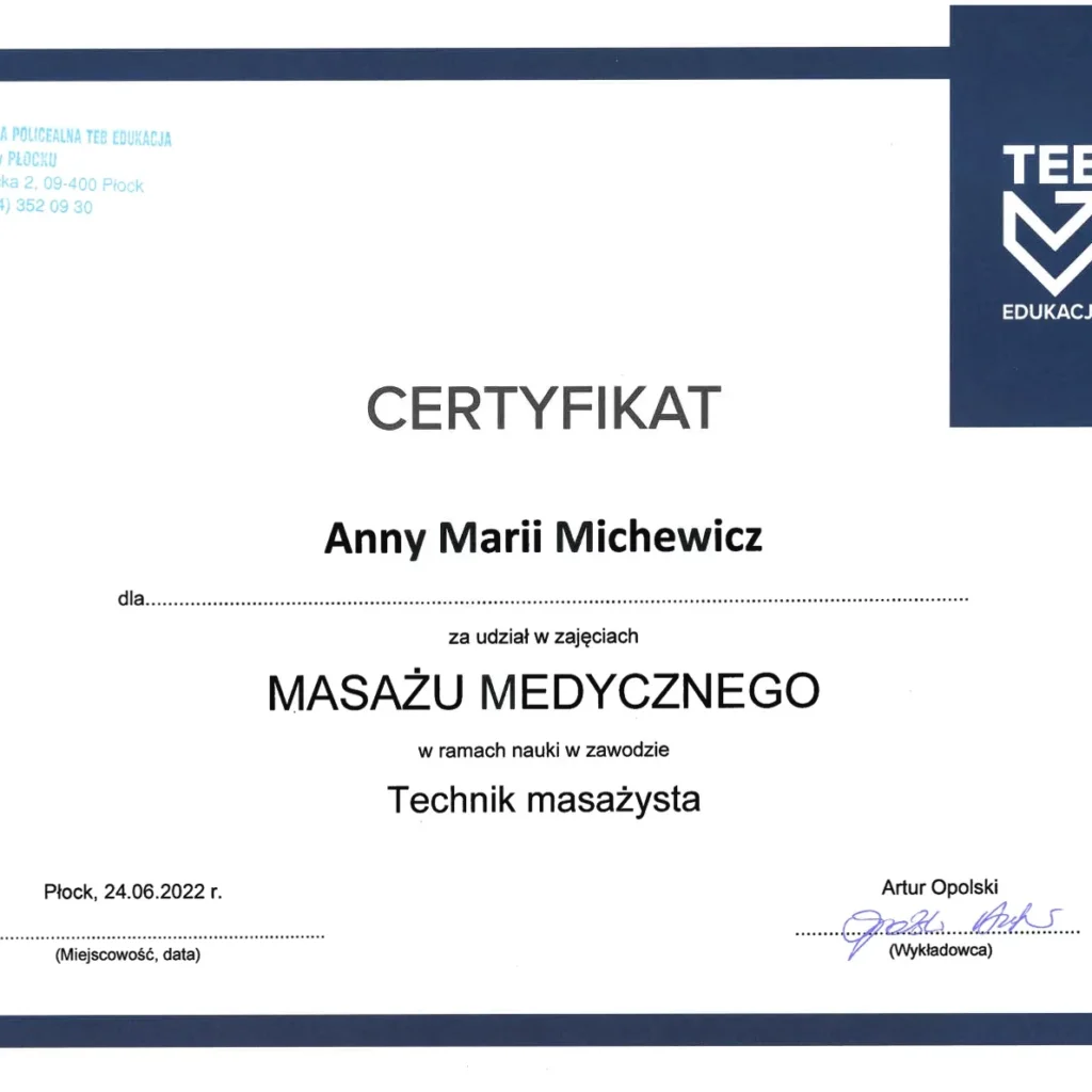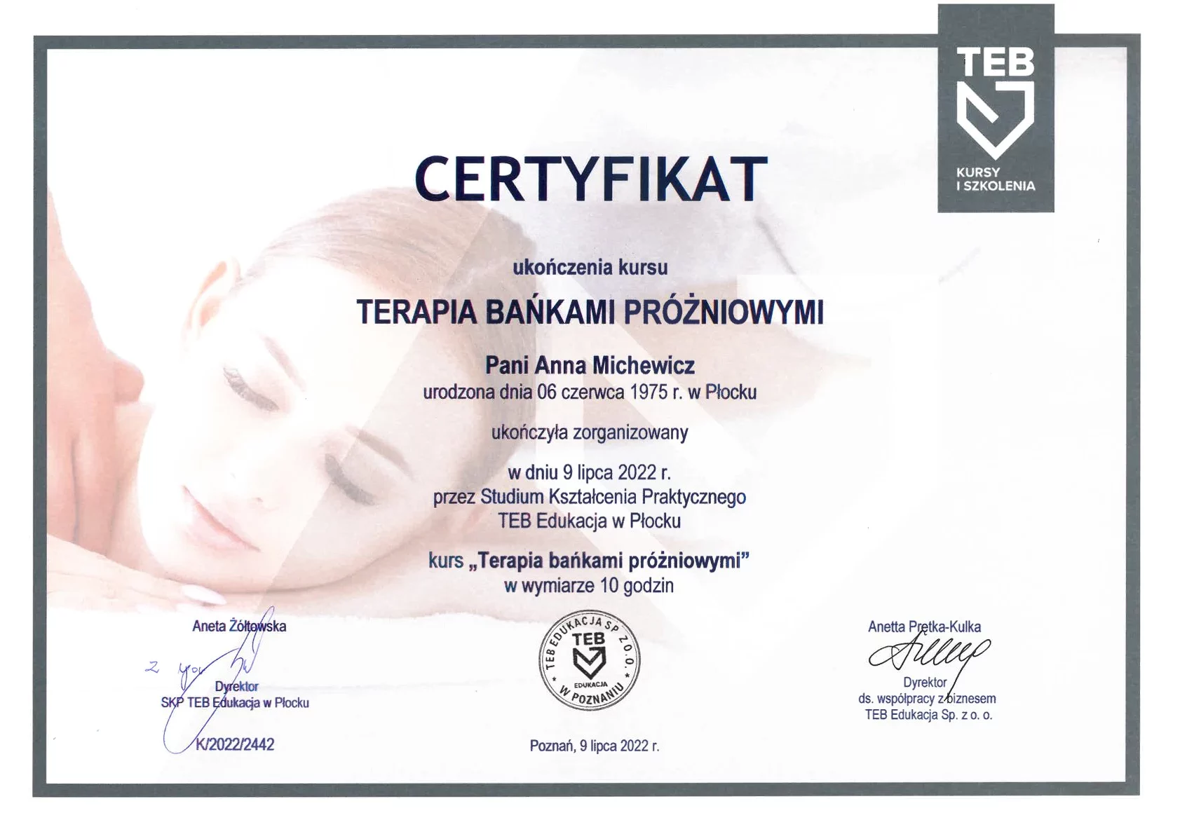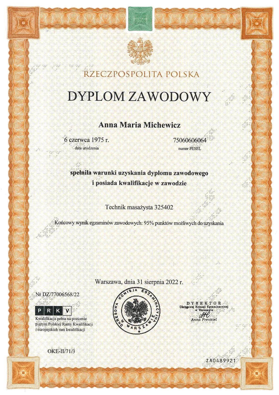 W lipcu 2018 r. wróciłam z moją rodziną do Polski. Z biegiem lat moją uwagę i zainteresowanie przyciągnęły głębsze aspekty masażu, czyli jego wpływ nie tylko na sferę emocjonalną i duchową, ale również fizyczną organizmu ludzkiego. Chęć poznania zasad funkcjonowania organizmu ludzkiego jako całości, jego anatomii i fizjologii oraz źródeł bóli i napięć mięśniowych innych niż te spowodowane stresem i trybem życia, spowodowały, że we wrześniu 2020 r. podjęłam naukę na 2-letnim kierunku technika masażysty z elementami fizjoterapii. Szkołę ukończyłam z wynikiem bardzo dobrym w czerwcu 2022 r.