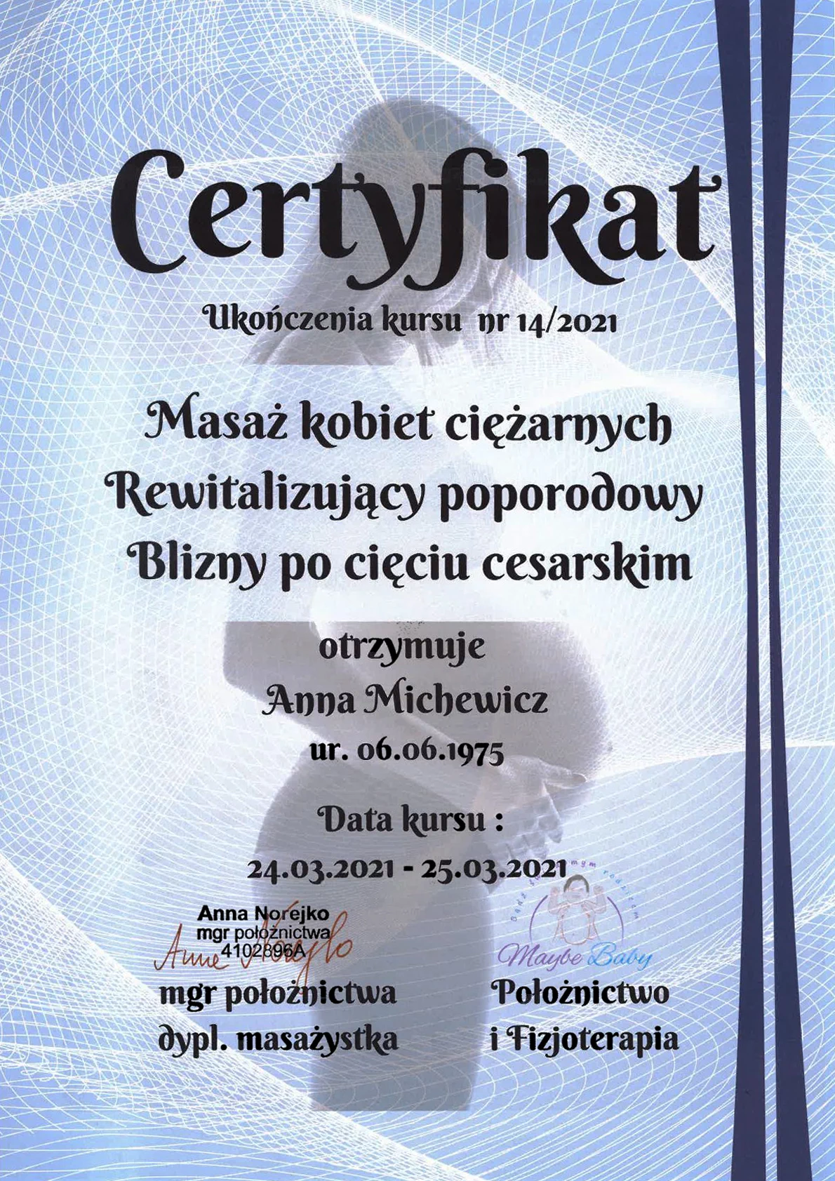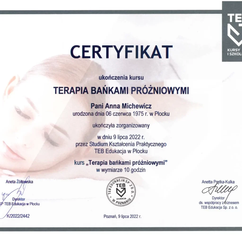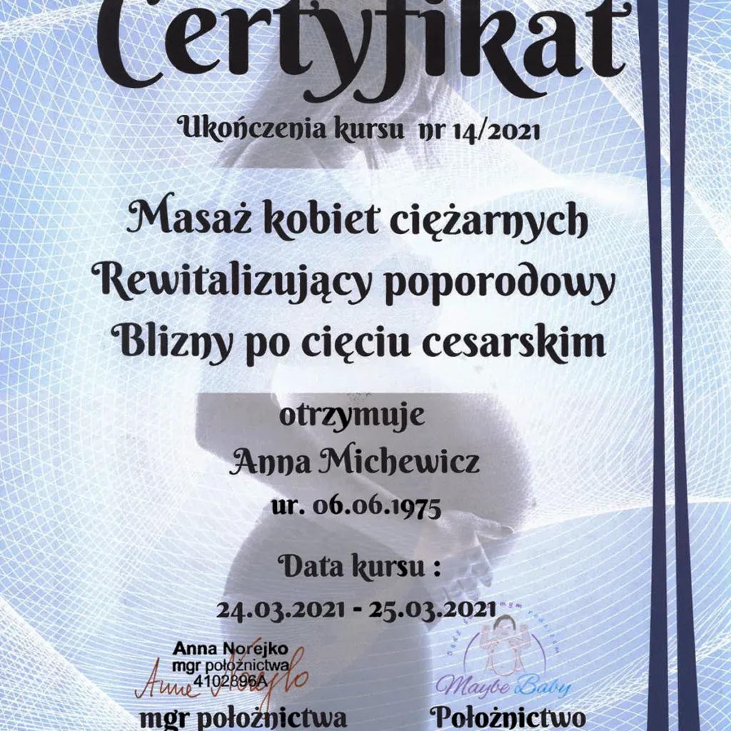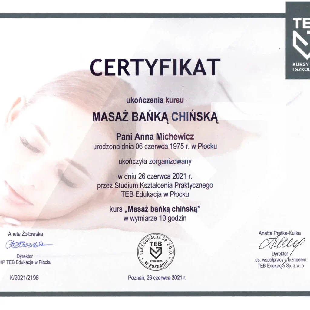 W lipcu 2018 r. wróciłam z moją rodziną do Polski. Z biegiem lat moją uwagę i zainteresowanie przyciągnęły głębsze aspekty masażu, czyli jego wpływ nie tylko na sferę emocjonalną i duchową, ale również fizyczną organizmu ludzkiego. Chęć poznania zasad funkcjonowania organizmu ludzkiego jako całości, jego anatomii i fizjologii oraz źródeł bóli i napięć mięśniowych innych niż te spowodowane stresem i trybem życia, spowodowały, że we wrześniu 2020 r. podjęłam naukę na 2-letnim kierunku technika masażysty z elementami fizjoterapii. Szkołę ukończyłam z wynikiem bardzo dobrym w czerwcu 2022 r.
